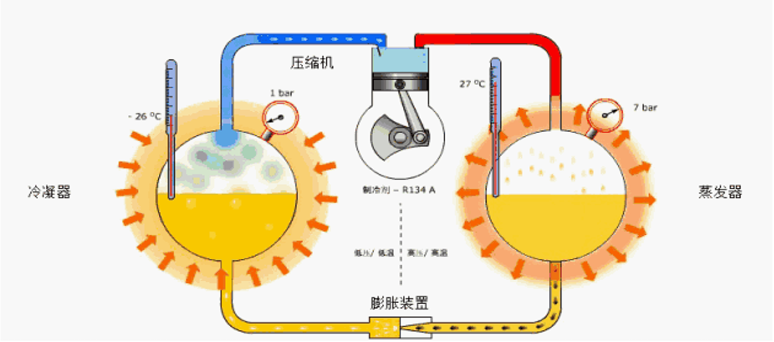 蒸發(fā)一體機(jī)的壓縮機(jī)將蒸發(fā)器的低溫低壓制冷劑氣體吸入,壓縮成高溫高壓氣體,再排入冷凝器,與冷媒水進(jìn)行熱交換而成為低溫高壓的制冷劑液體