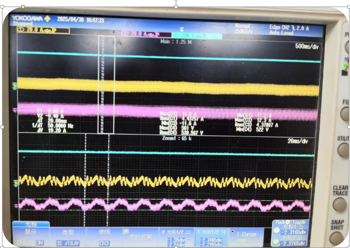 現(xiàn)場調(diào)試時,架上示波器,監(jiān)視變頻器運行的畫面
