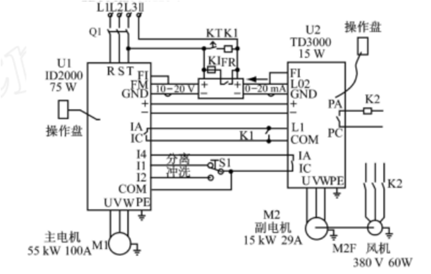 2:現(xiàn)場主速55kW,副速15kW變頻器,搭配使用。