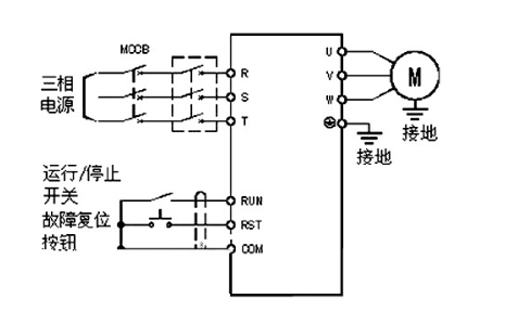 變頻器和電機(jī)之間存在一定距離,因此變頻器和電機(jī)都要做好接地的準(zhǔn)備。